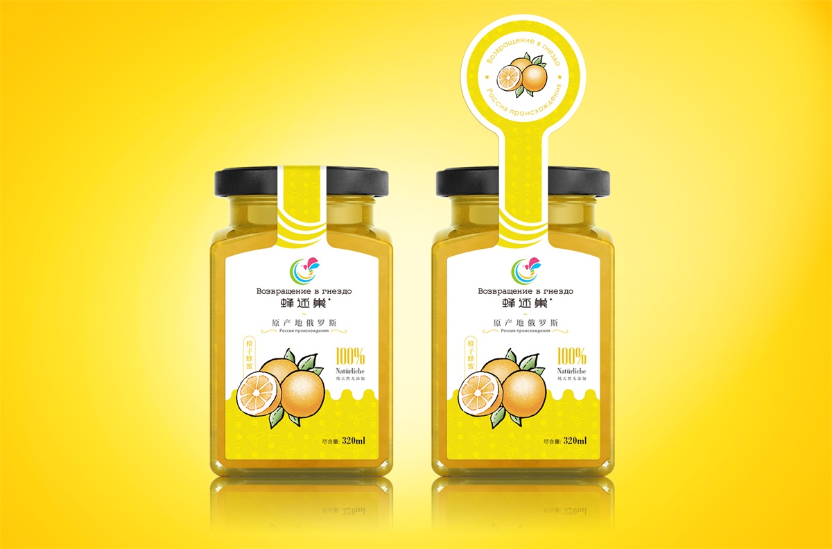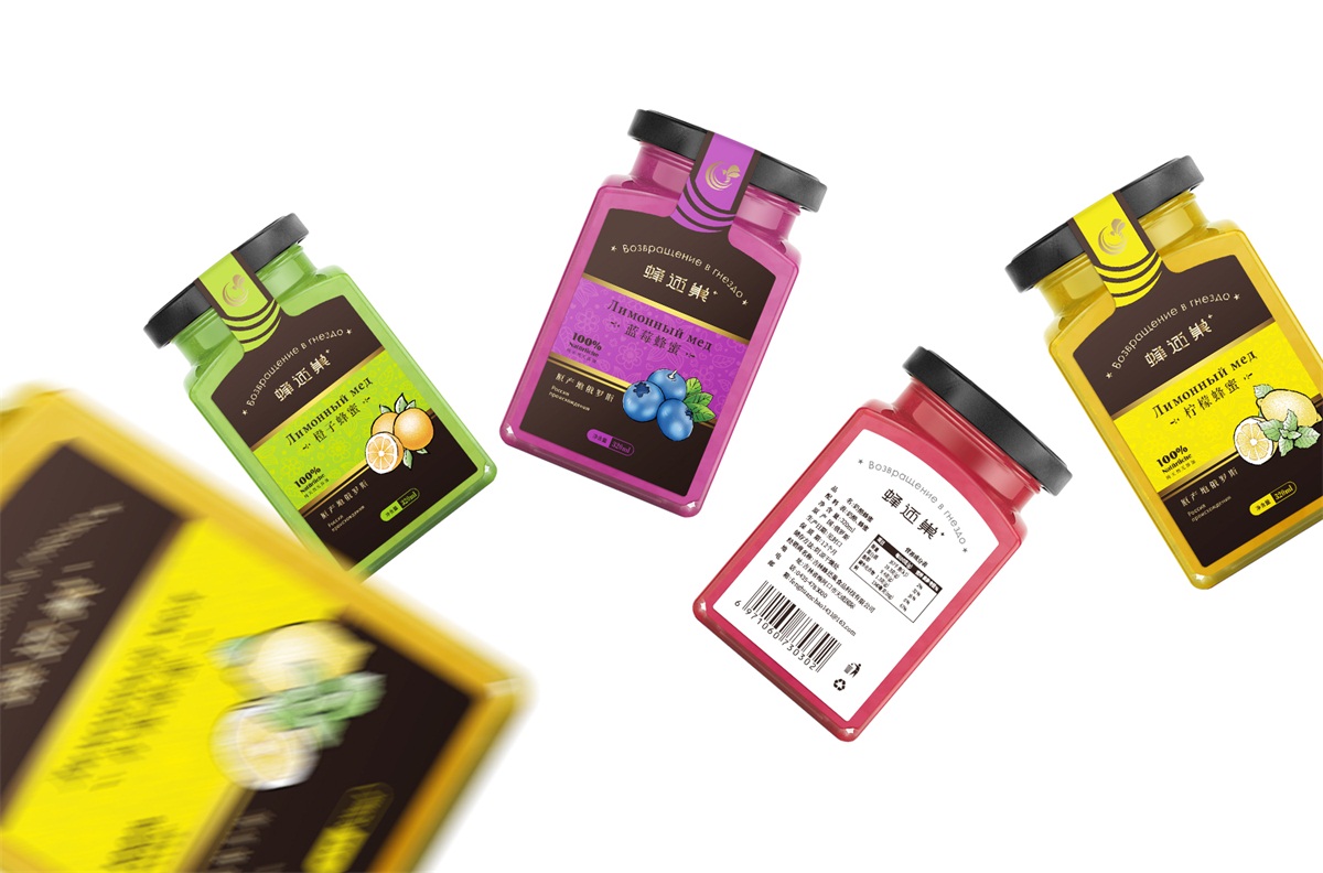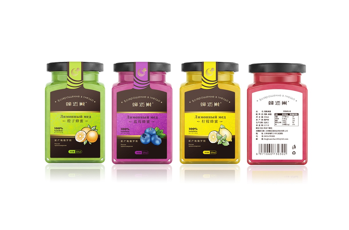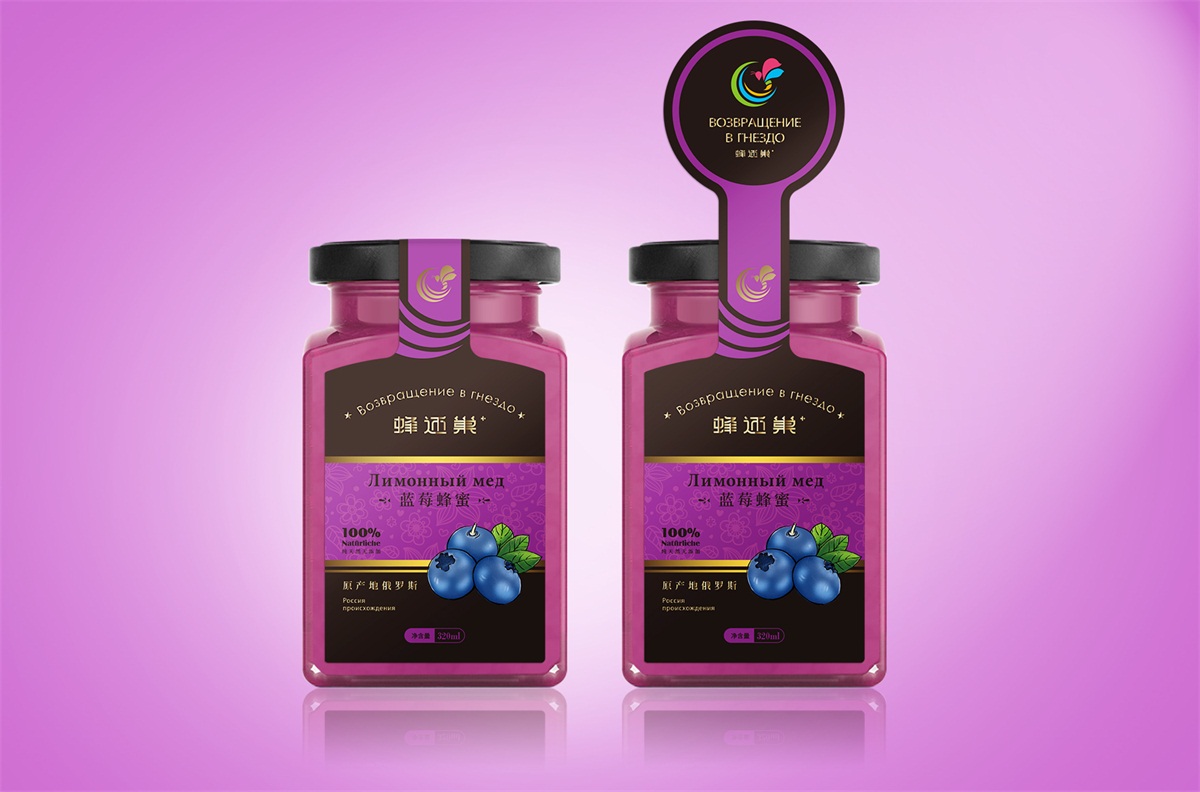 蜂還巢俄羅斯彩色蜂蜜精選天然成熟蜂蜜經多重過濾精制而成,選材考究,天然的彩色蜂蜜本身就獨具差異化,所以這個系列的包裝彩用透明玻璃瓶設計,讓彩色的蜂蜜直接呈現在消費者眼睛,標簽只做口味區分即可,簡單明了。