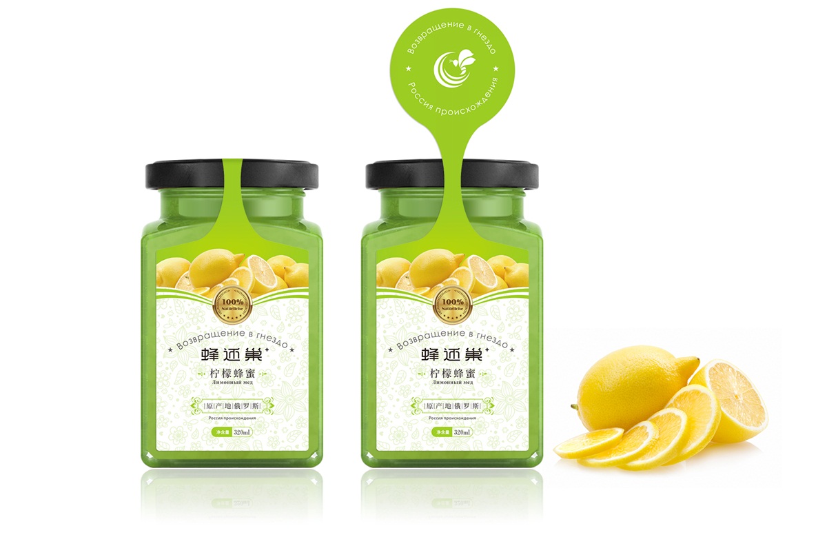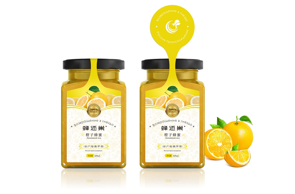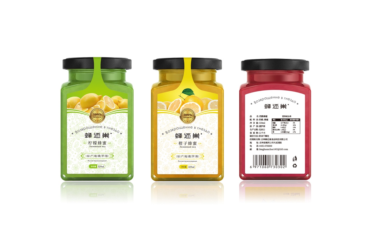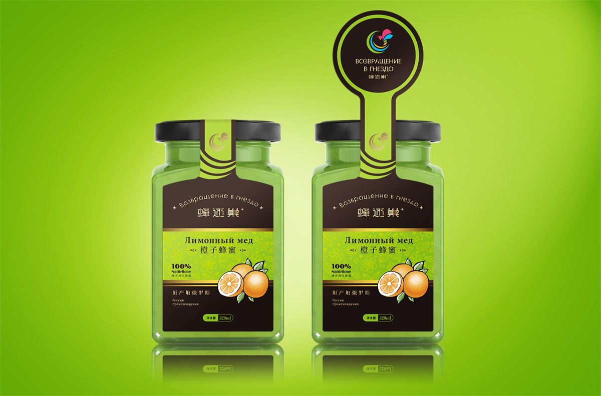 蜂還巢俄羅斯彩色蜂蜜精選天然成熟蜂蜜經多重過濾精制而成,選材考究,天然的彩色蜂蜜本身就獨具差異化,所以這個系列的包裝彩用透明玻璃瓶設計,讓彩色的蜂蜜直接呈現在消費者眼睛,標簽只做口味區分即可,簡單明了。