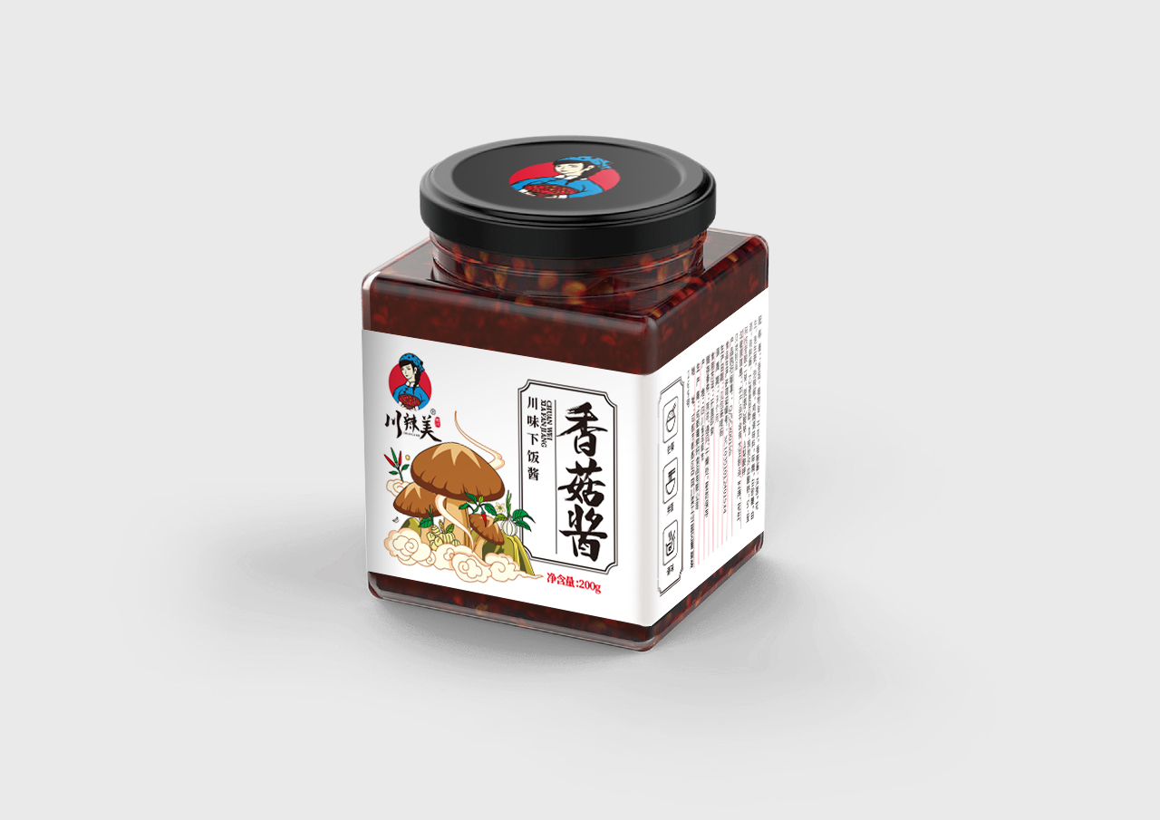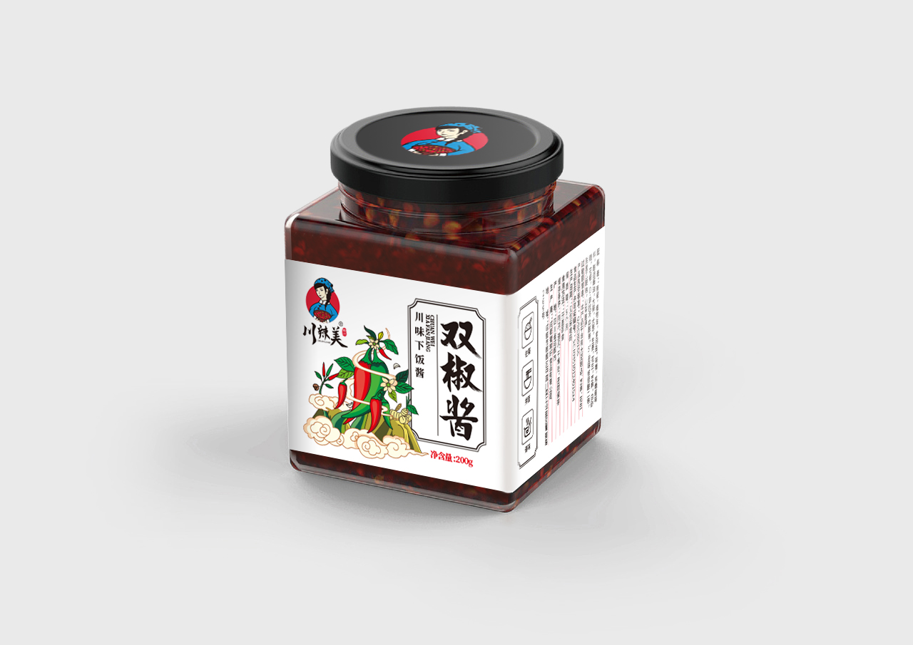 川辣美辣椒醬屬于地方特產類,本方案選用了方形的玻璃瓶+瓶身標簽設計的形式。 來自四川的美味辣椒醬品牌,古風、韻味、親和,從品牌logo設計,包裝瓶的選擇,到系列包裝形象設計,方案將雙椒醬、燒椒醬、香菇醬、香菇牛肉醬四個品類以插畫風格進行創作,以系列感來呈現,品牌感強,接地氣